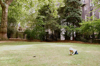 Anyways....on this particular excursion into the city, Evelynn had maxed out her content disposition and she was quite whiny. Cheerios and grapes would not satisfy her this time. We kind of tried all that we could think of to make her happy....food, shoulder rides, various toys, singing, soother....Then we stumbled upon this park. The park is what she wanted. As soon as we let her go, she was crawling all around just happy to be free. Never mind that it was a "private residential" park. We were very thankful for this park.